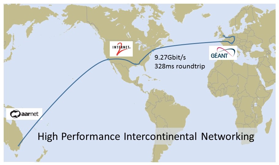 For the R&E test the networks used were GÉANT (Europe), Internet 2 (North America) and AARnet (Australia). To make the GÉANT test scenario more representative of a real-world condition, the traffic from the London DTN was routed via Amsterdam, Frankfurt, Geneva and Paris before transiting across Internet2 to its destination in AARnet.