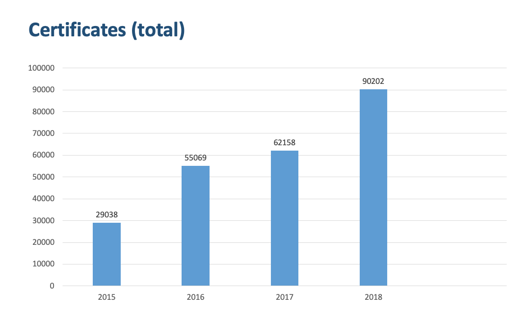 The total number of certificates downloaded by all organisations using the TCS is steadily increasing every year, reaching over 90,000 in 2018.