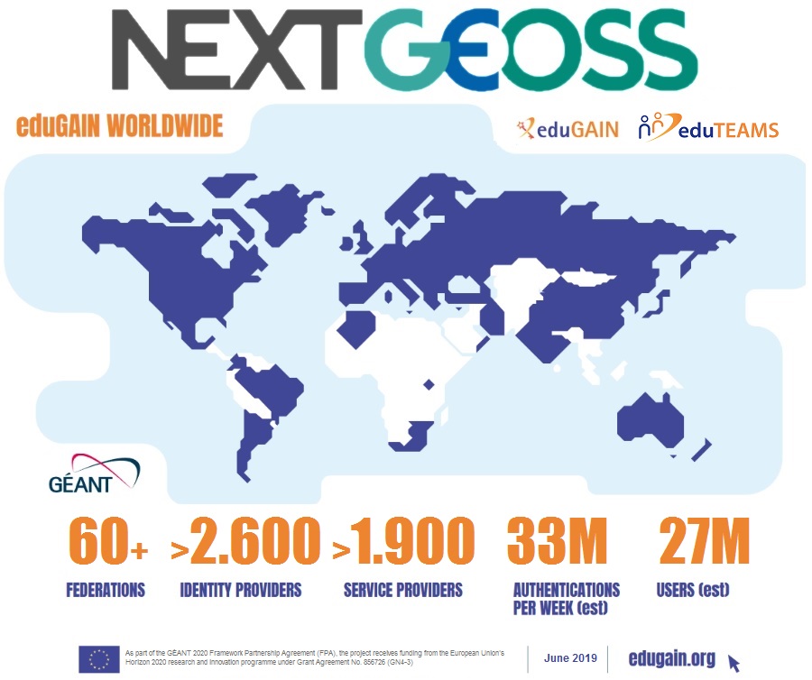 The GÉANT Association, the leading collaboration on network and related infrastructure and services for the benefit of research and education, and NextGEOSS, the European contribution to global earth observation system of systems (GEOSS) and a prominent project of H2020, have established a collaboration in order to maximise their objectives for connecting NextGEOSS services with eduGAIN via eduTEAMS.