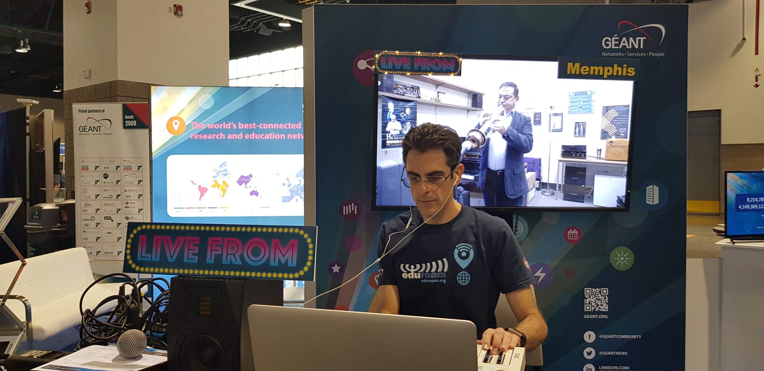 A total of four remote concerts were performed at our booth showing how only two CESNET boxes, combined with our powerful R&E network, could enable two musicians located at different cities to play with each other with almost no delay to be heard. Another great demonstration was that of eduMEET, the user-friendly and open source video conferencing tool designed by the community which enables anyone to join a call, anytime.