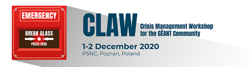 The CLAW Crisis Management event for the GÉANT community is back this year to help all NRENs enhance their crisis management preparedness. CLAW will take place on December 1 and 2, kindly hosted by PSNC in Poznan, Poland. We will use these two days together to train vital crisis management skills, exchange our experiences from the COVID pandemic crisis and put everything to the test in a crisis exercise.