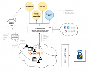 - Identity and Access management service, which manages users access. With the identity linking capabilities and the support of bridging multiple authentication protocols, the MyAcademicID Identity and Access Management Service builds on top of eduGAIN and enables federated access to Erasmus+ services.
