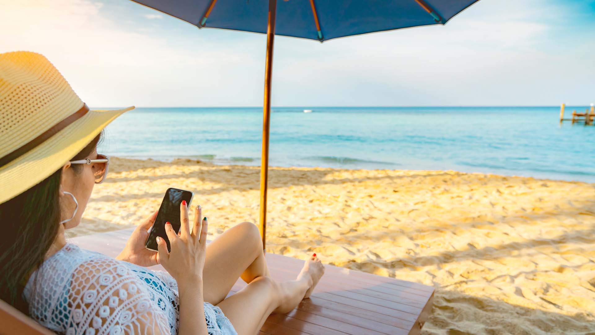 On an ordinary beach in an ordinary country, an ordinary girl is lying in the sun and enjoying her summer holidays whilst surfing the net with her smartphone looking for bargains!