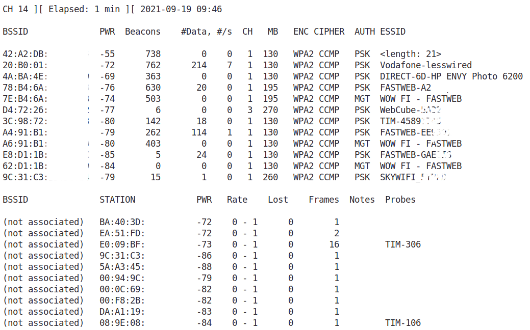 With this last command, you list all detected access points with its associated clients, on all possible radio channels, something like that (“personal” info like MAC addresses or full ESSID are partially erased):