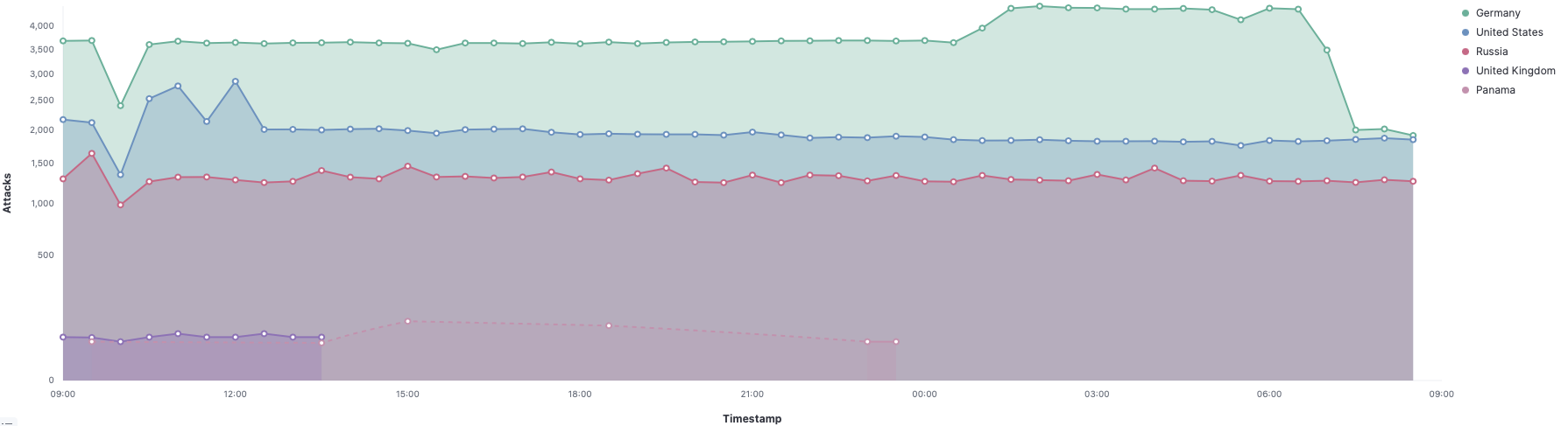 Fig. 1 shows a map with the locations of attackers, while Fig. 2 instead shows the number of attacks received over time from some countries: we observe that most of the attacks come from Germany, Russia, United Kingdom, USA, etc. Attacks come at a constant rate overtime, with on average 10000 attacks per hour! Each of these attacks corresponds to a login attempt, where the attacker tries to gain access to your computer.