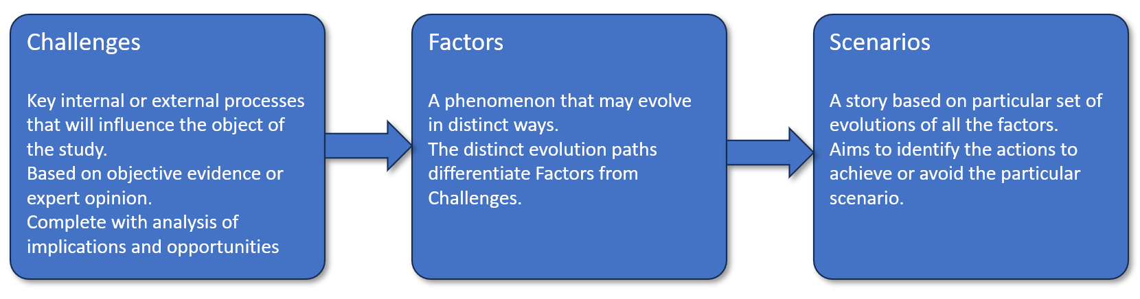 The thought-process is based upon three key steps: identifying challenges, determining factors, and developing scenarios. To modify the outcomes of the report, you’d only have to introduce changes in any one of three steps reflecting the situation in your environment.