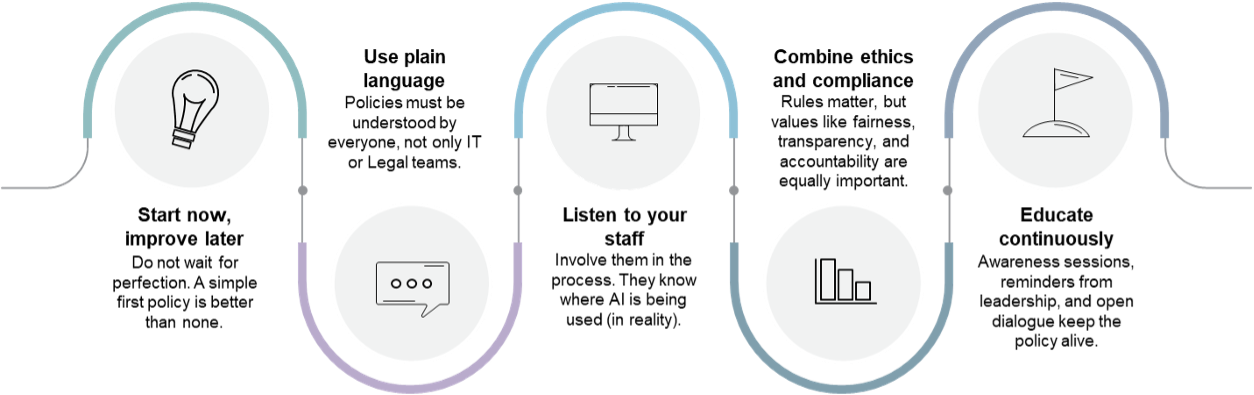 Finally, clear policies reinforce that accountability always remains with people, not with the technology. Staff cannot claim “AI made me do it.” Just as with any other system, users are responsible for how AI is applied. Strong policies help to protect institutions by confirming that responsibility lies with the person in control, not the tool.